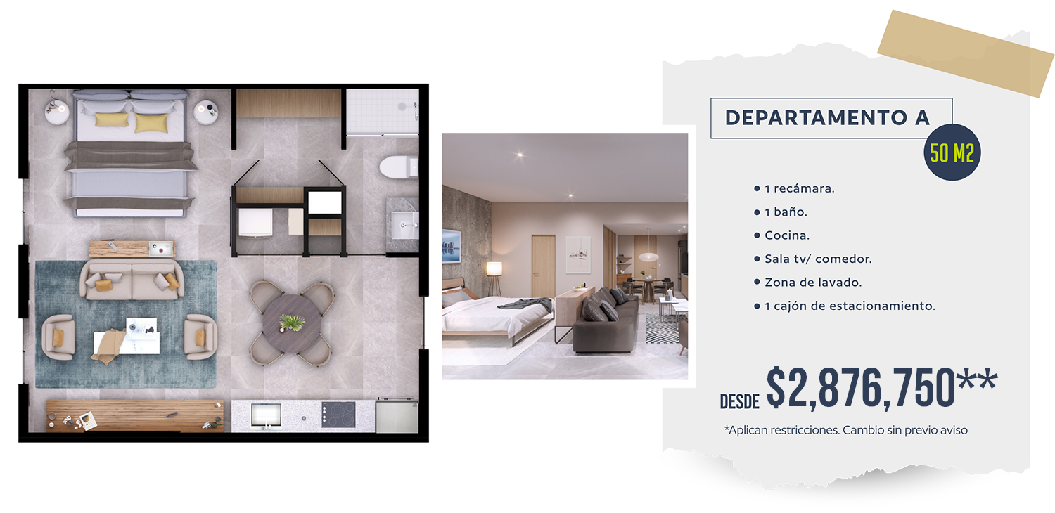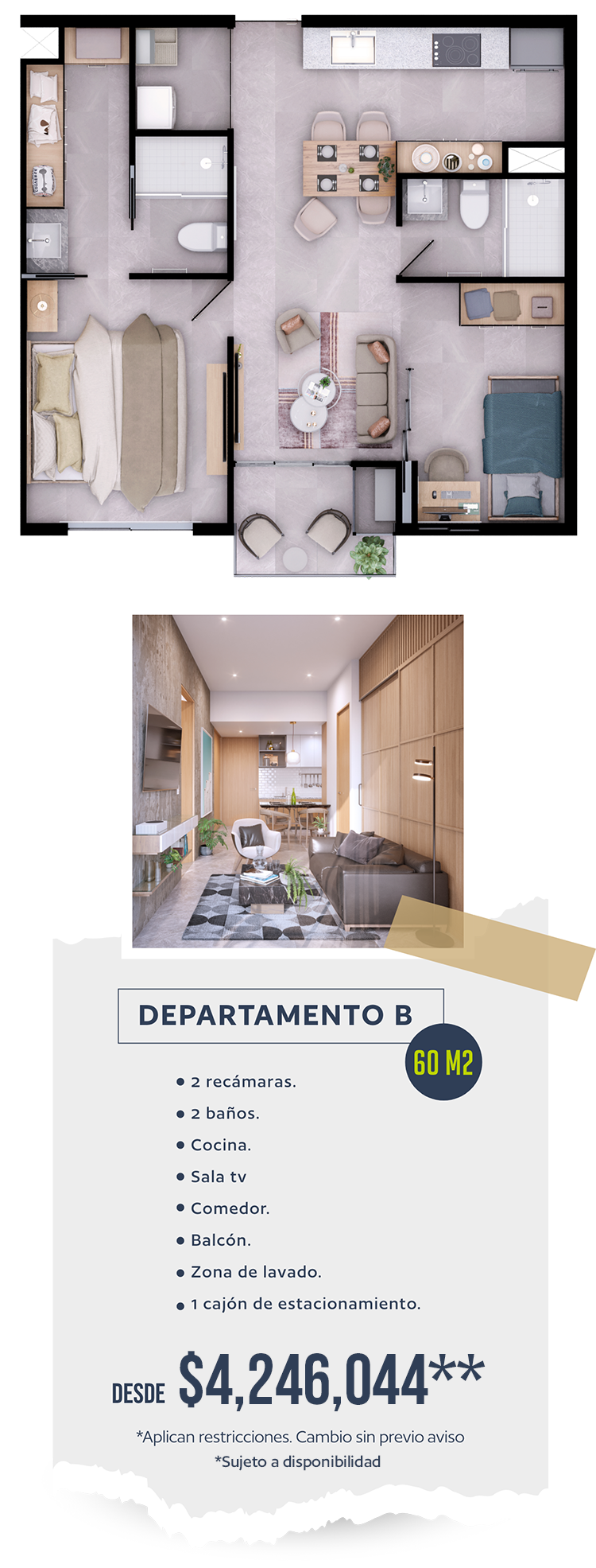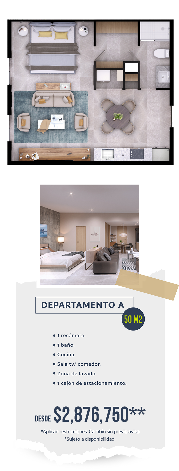 Las imágenes que se muestran son meramente ilustrativas y no representan una oferta vinculante y pueden variar del proyecto final. El desarrollador se reserva el derecho de realizar cualquier cambio o adecuación conforme el proyecto y planos autorizados por las autoridades respectivas.